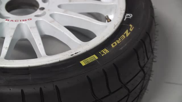 Mechanic in rally paddock checking Brenbo brake calipers in prep for a race; panning shot.