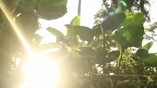 > Slide through rainforest vines, sun peaking through