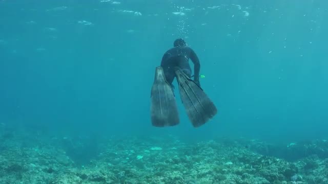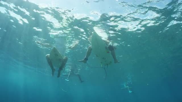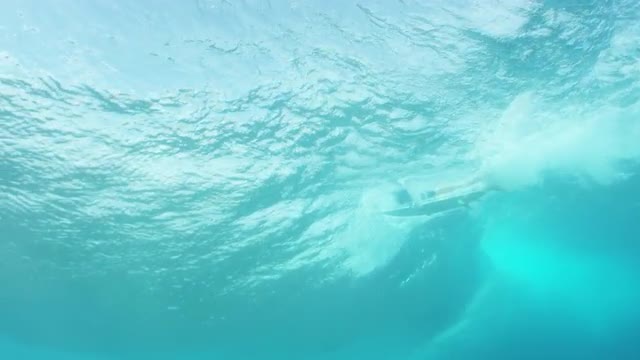 Surfer catching a wave shot from underwater as the camera pans through the sunlight.