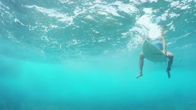 Set of waves rolling through lineup, shot from underwater. Includes surfers.