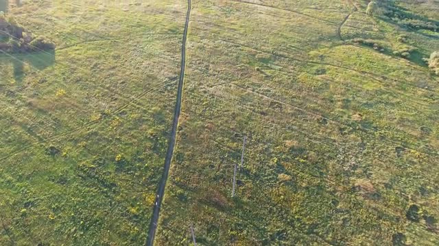 966227 - Aerial view flying over woman walking on desert dirt road
