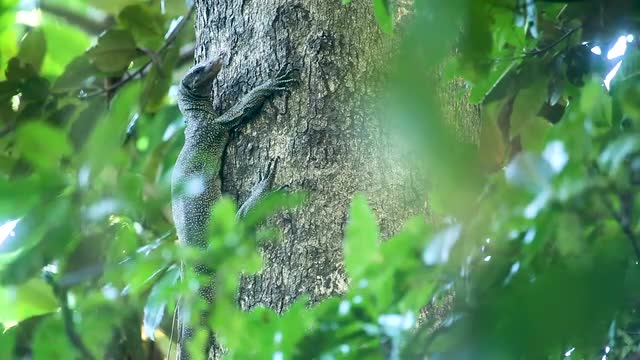 793237 - Slow tilt up on rainforest leaves near Kompia, close