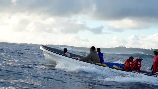 > Crew in fast boat on bumpy water, high speed