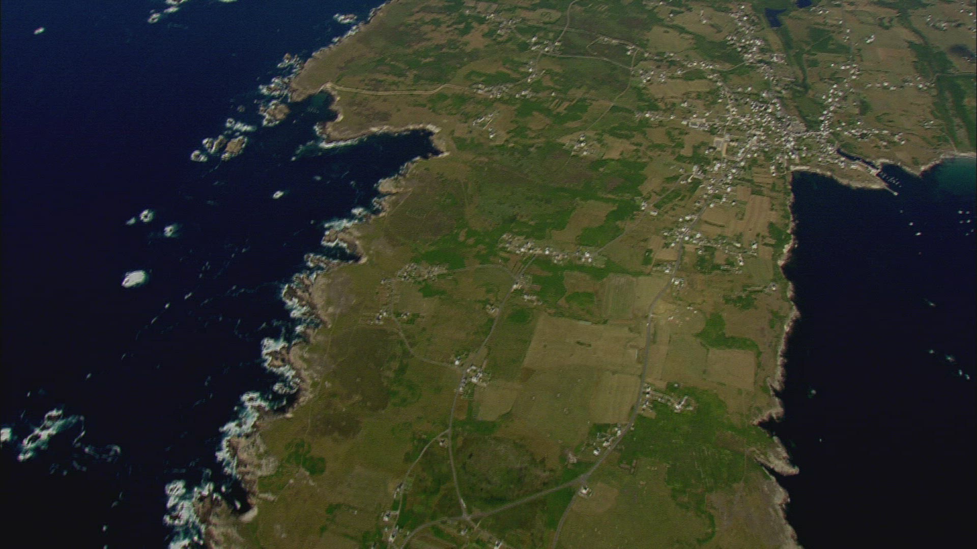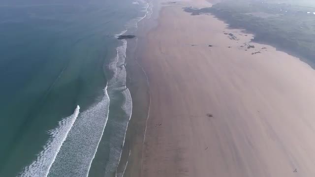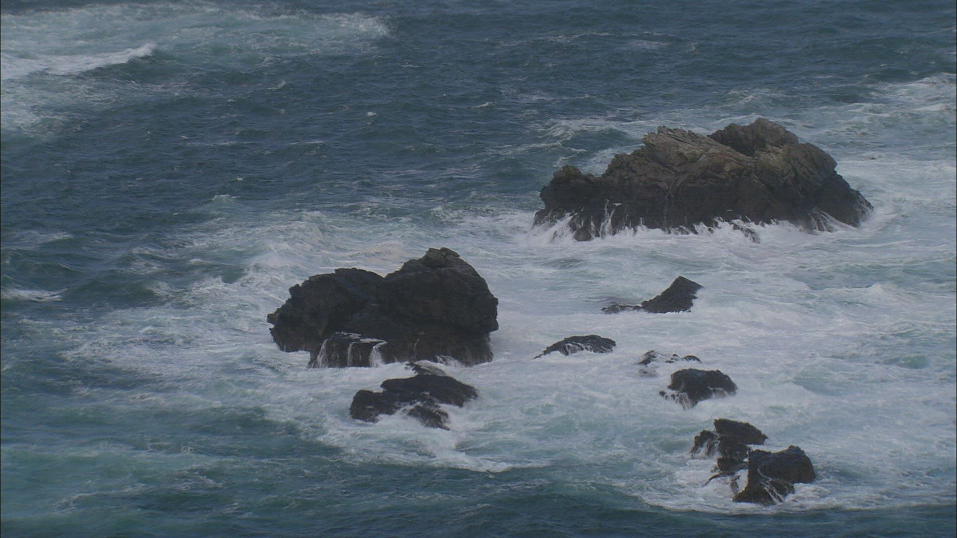 Aerial rising top down view of breaking waves along rocky ocean shore