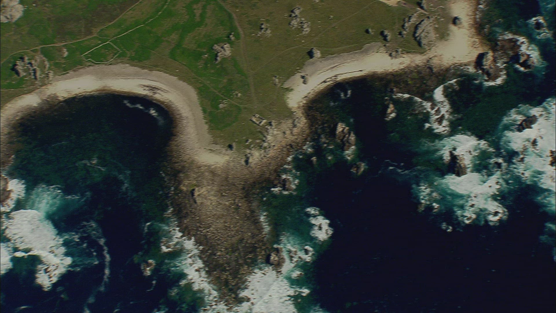 > Aerial rising top down view of breaking waves along rocky ocean shore