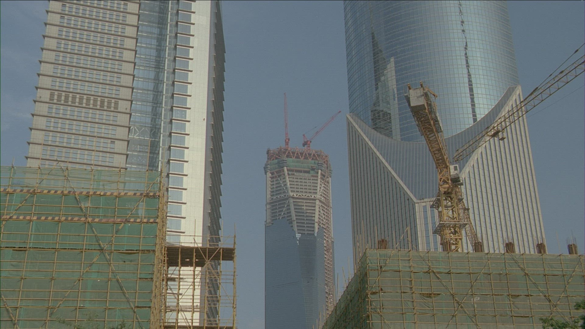 Shot on a rooftop inner city Shanghai, with traffic moving in distance. Sunny day with clouds. Mix of modern building and tradtional Shanghai housing.