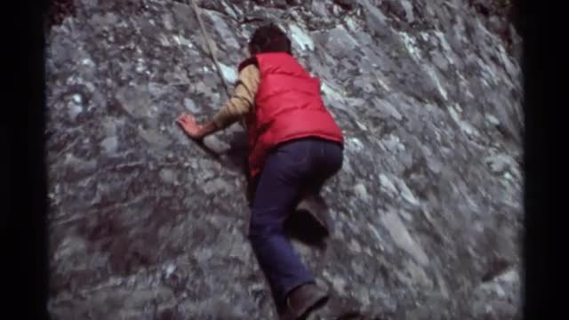 681351 - 1975: people rock climbing on granite wall in the early days of mountaineering sports AGATE SPRINGS
