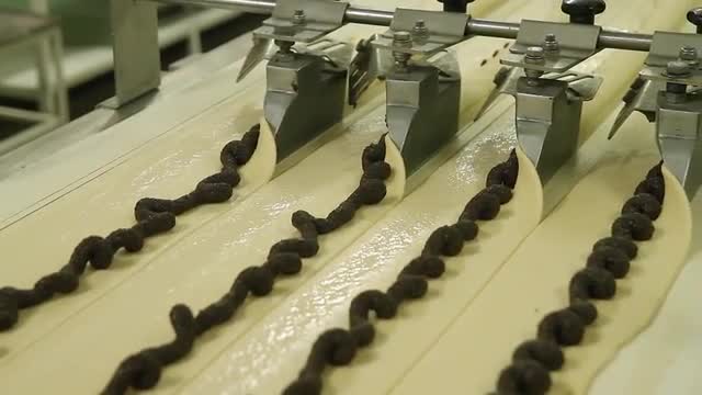 Stacking bread from conveyor on the shelves. Bakery job. Unloading of bread from the conveyor. Worker takes bread from the bakery conveyor. Delivery of white bread. Manufacture of bakery products.
