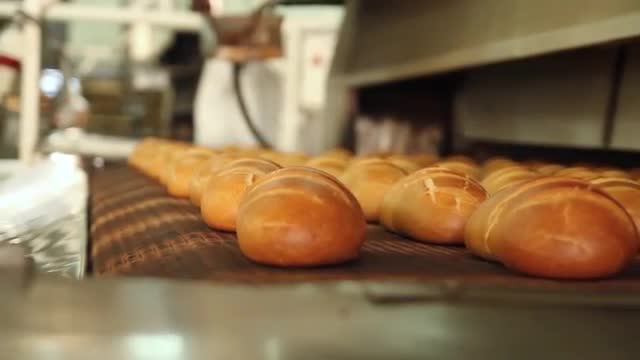 Production of buns. Plant for the production of bread. Bread from the oven. Baking buns. Buns on the conveyor. Confectionery. Bakes rye bread. Bread bakery food factory production with fresh products.