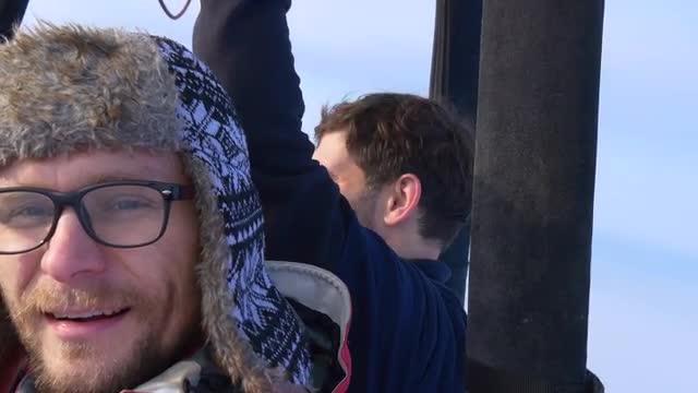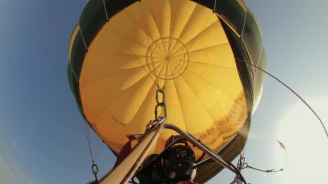 Drone shot revealing a hot air balloon as the burner fires and it rises into the blue, sunrise sky.