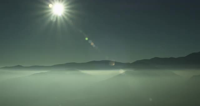 Low level drone shot floating through the mist lit by orange rays of sun.