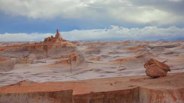 Dolly move on a pumice rock field with clouds above it.