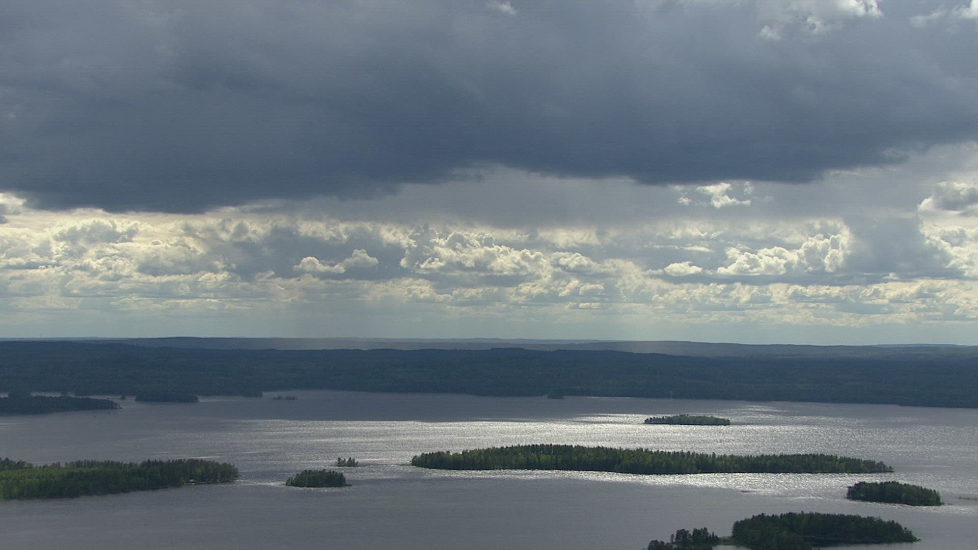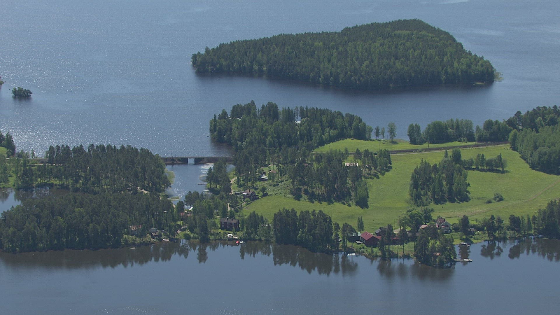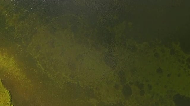 Aerial view looking down at mossy lake moving from shore to the depths.
