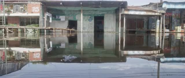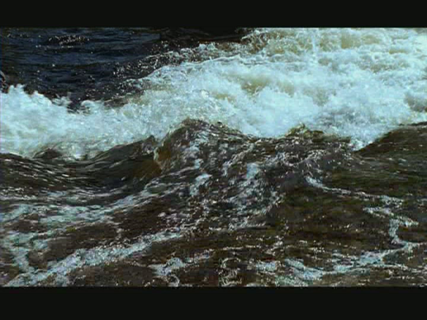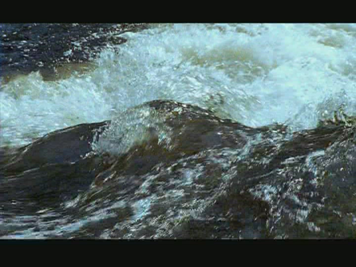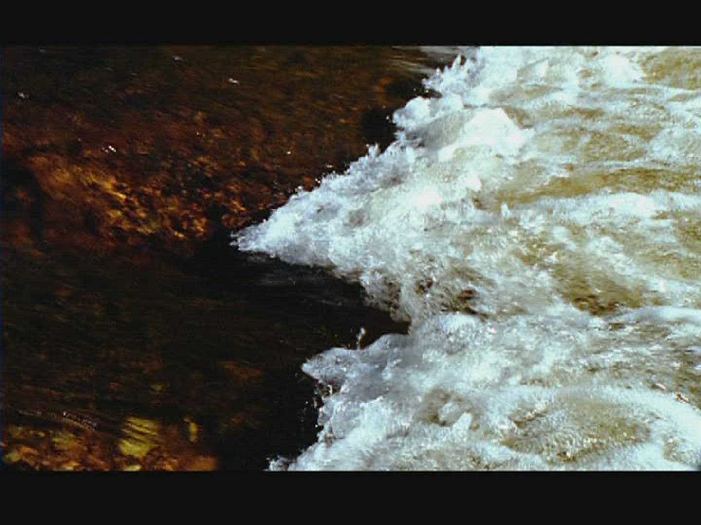 Spawning Kokanee Salmon school viewed underwater and above water in split view of rocky bottom stream with bushes
