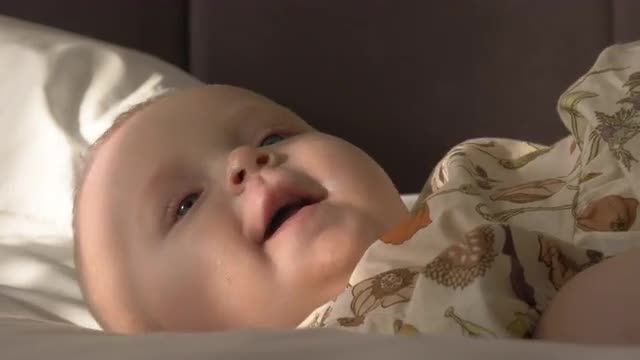 > Baby plays with smartphone and touches the screen. Blue light on face. Handheld shot