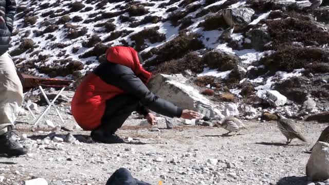 > Aerial shot of two mountaineers climbing up snowy mountain