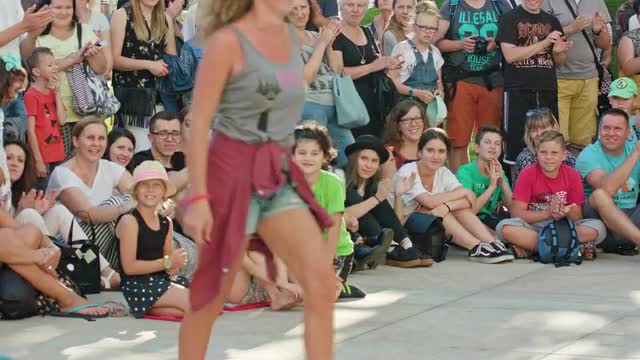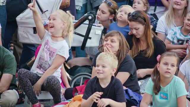 Lublin, Poland - July 2017: Kids and adults are laughing and claping while watching street performance of juggler within Festival Sztukmistrzow sitting on the paving tile down the street. Sunny. Outdoor. Medium. Stabilized