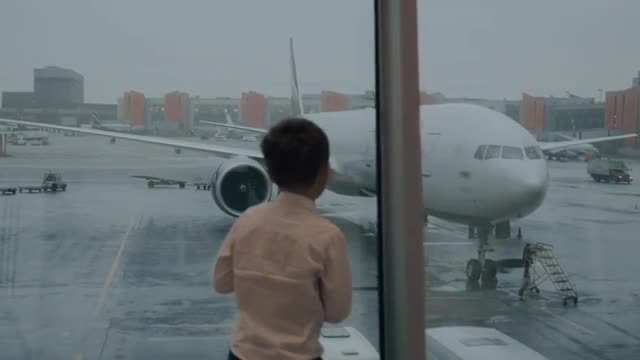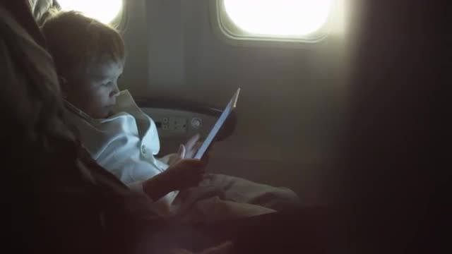 A year-old kid looks out the window of an airplane