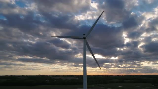 > Giant wind turbine turning at sunset under dramatic sky