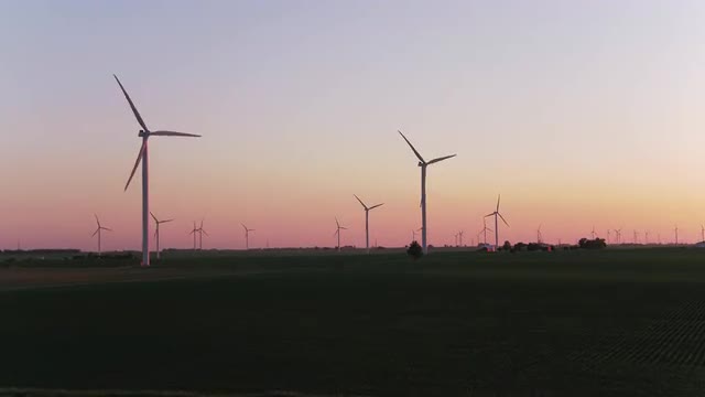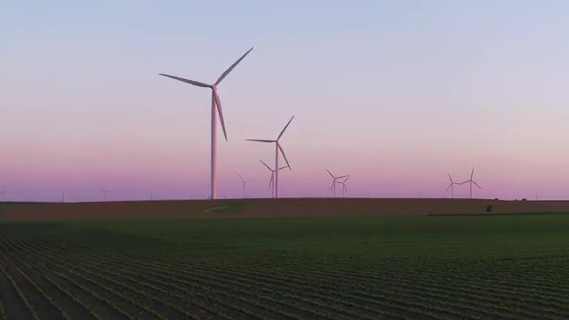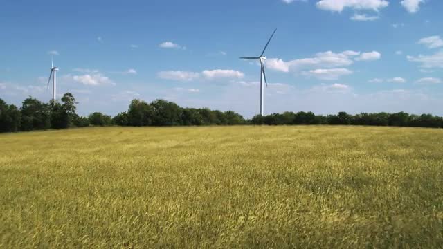801767 - Zoom in to wind turbines in breezy meadow