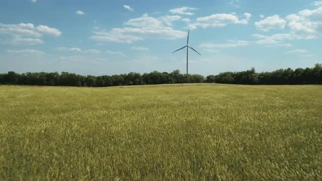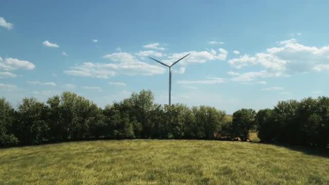 801771 - Zoom in to wind turbine in breezy meadow