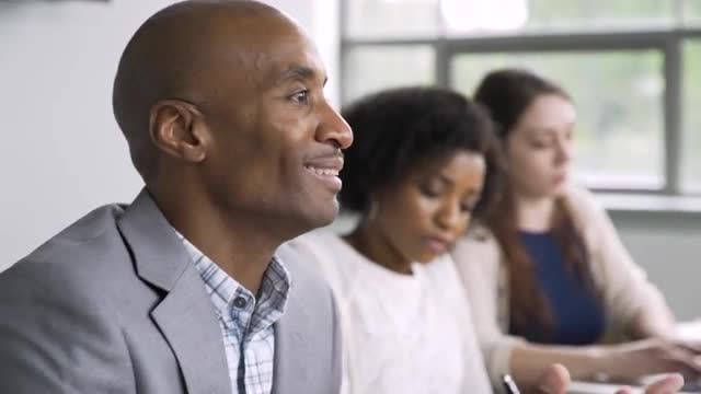 > Businessman talking and gesturing in meeting