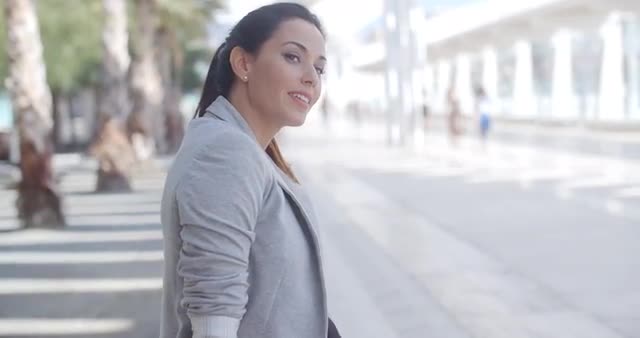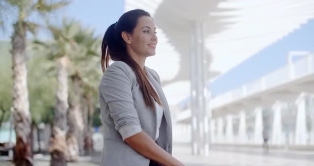 A beautiful female business executive shows her male business colleague her smart phone technology outside a glass office building in slow motion