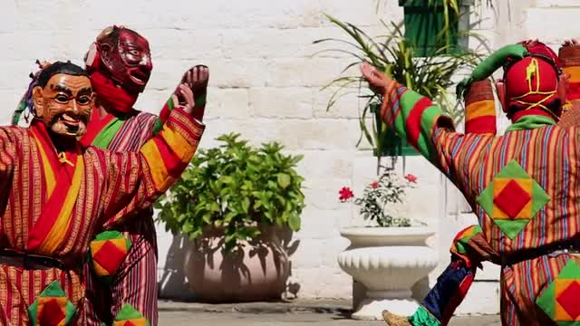 Bhutan festival clowns dancing with costumes and masks