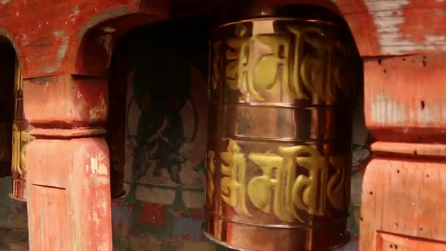 > Bhutan golden prayer bell behind wooden architecture