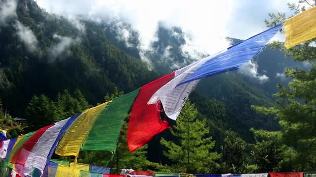 > Bhutan prayer flags colorful waving in the wind near Taktshang monastery