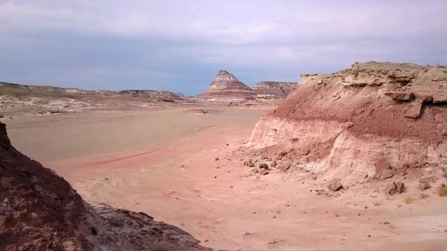 > Flying low through red rocky desert viewing the landscape