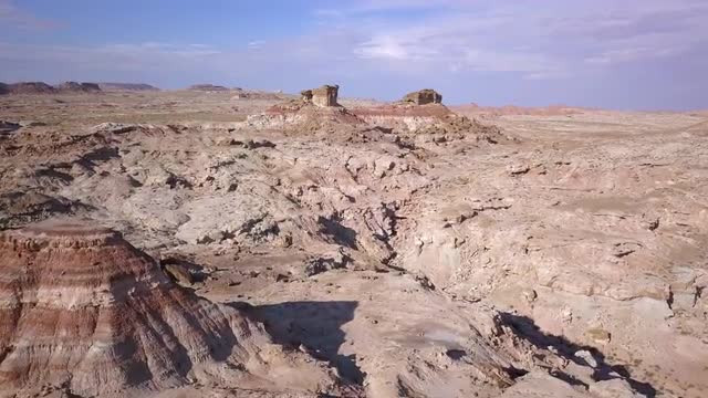 Flying through river bottom with foliage to rocky dry desert landscape in the Utah badlands.