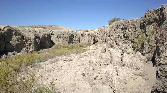 Slowly flying through dry eroded riverbed in the Utah desert.