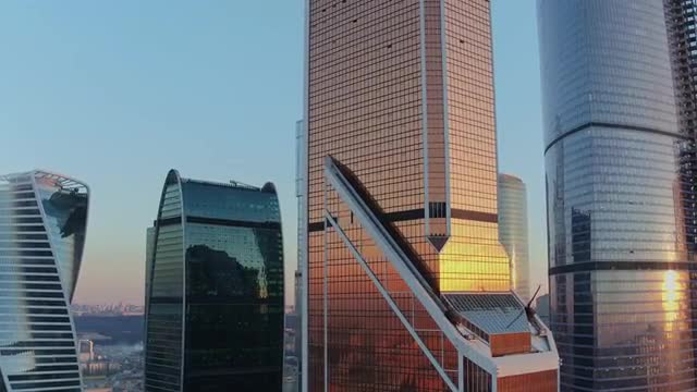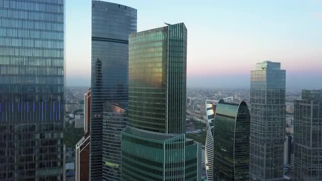 > Well dressed man and woman take selfie with smart phone outside business complex