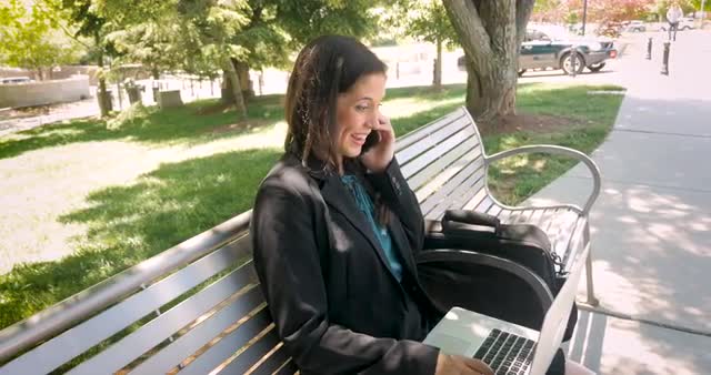 > Businesswoman working on her laptop and talking on her mobile phone