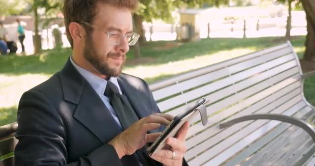 Business man with a beard and eyeglasses making silly faces while making typing gestures on a digital tablet sitting on a park bench in 4k