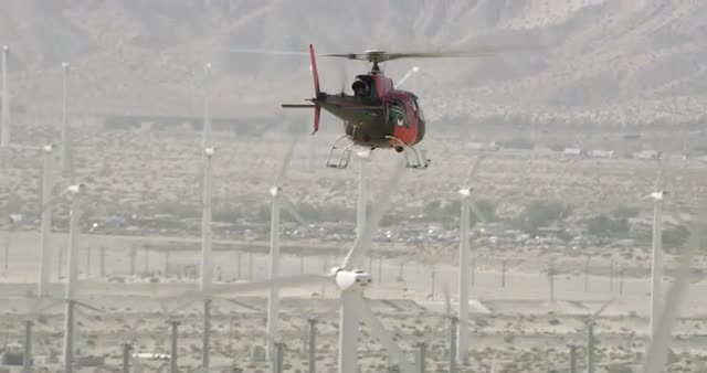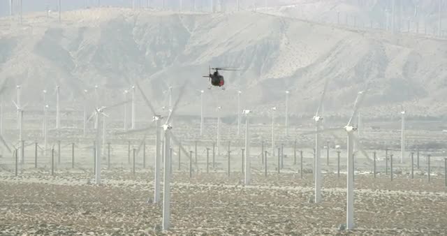 Aerial view of wind farm is desert of California filmed with a drone.