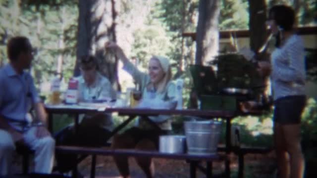 481914 - 1967: Family cooking breakfast at outdoor camping picnic table.