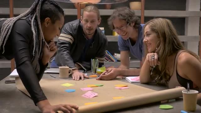 > Happy successful young entrepreneurs discussing blueprints in slowmo