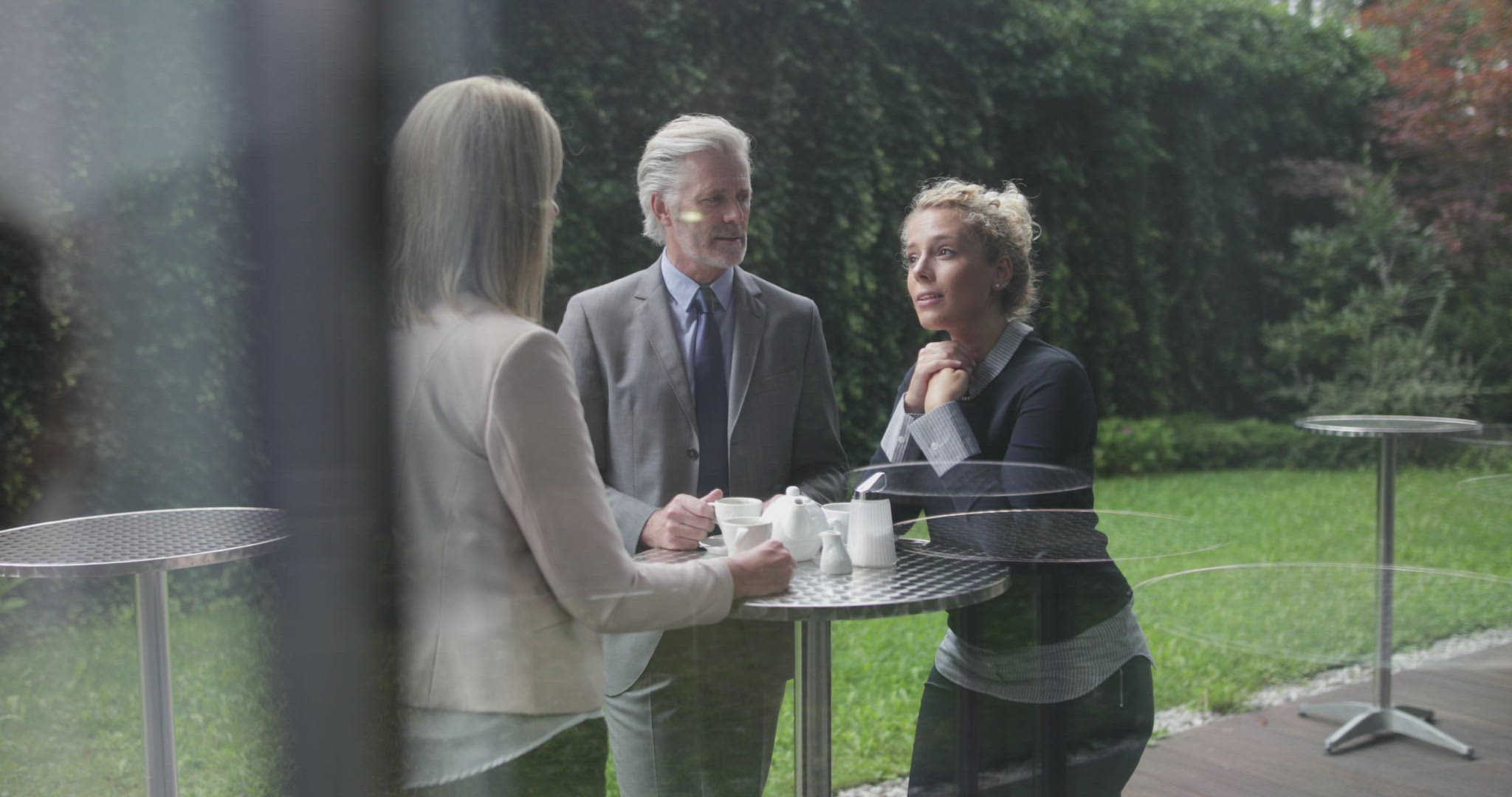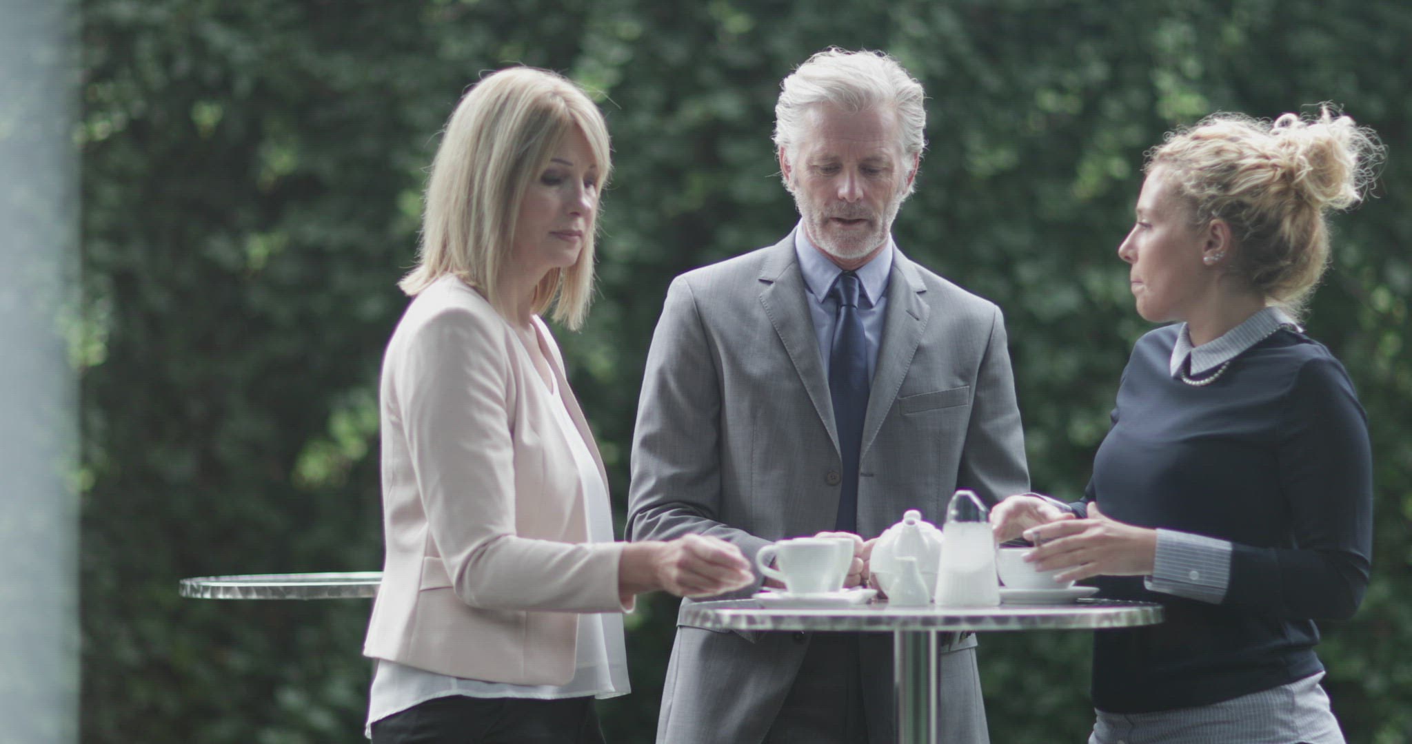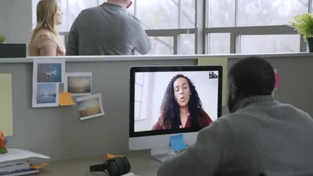 Creative young female business team discussing and collaborating on start up business while pointing at display screen in slow motion