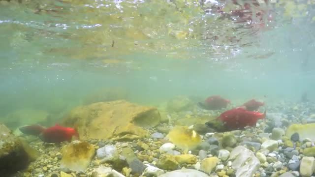 Red kokanee salmon spawning in small river viewed from underwater.