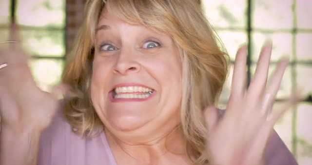 > Portrait of excited blond caucasian woman giving two thumbs up