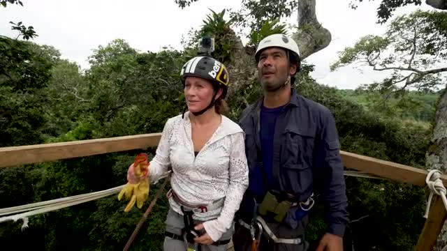 > Person Climbing Rainforest Trees, low wide pan, 4K