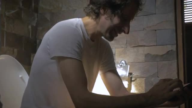 Push in low angle of a man sitting on a toilet while talking on his cell phone