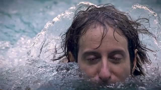 > Slow motion of a middle aged man swimming freestyle towards the camera