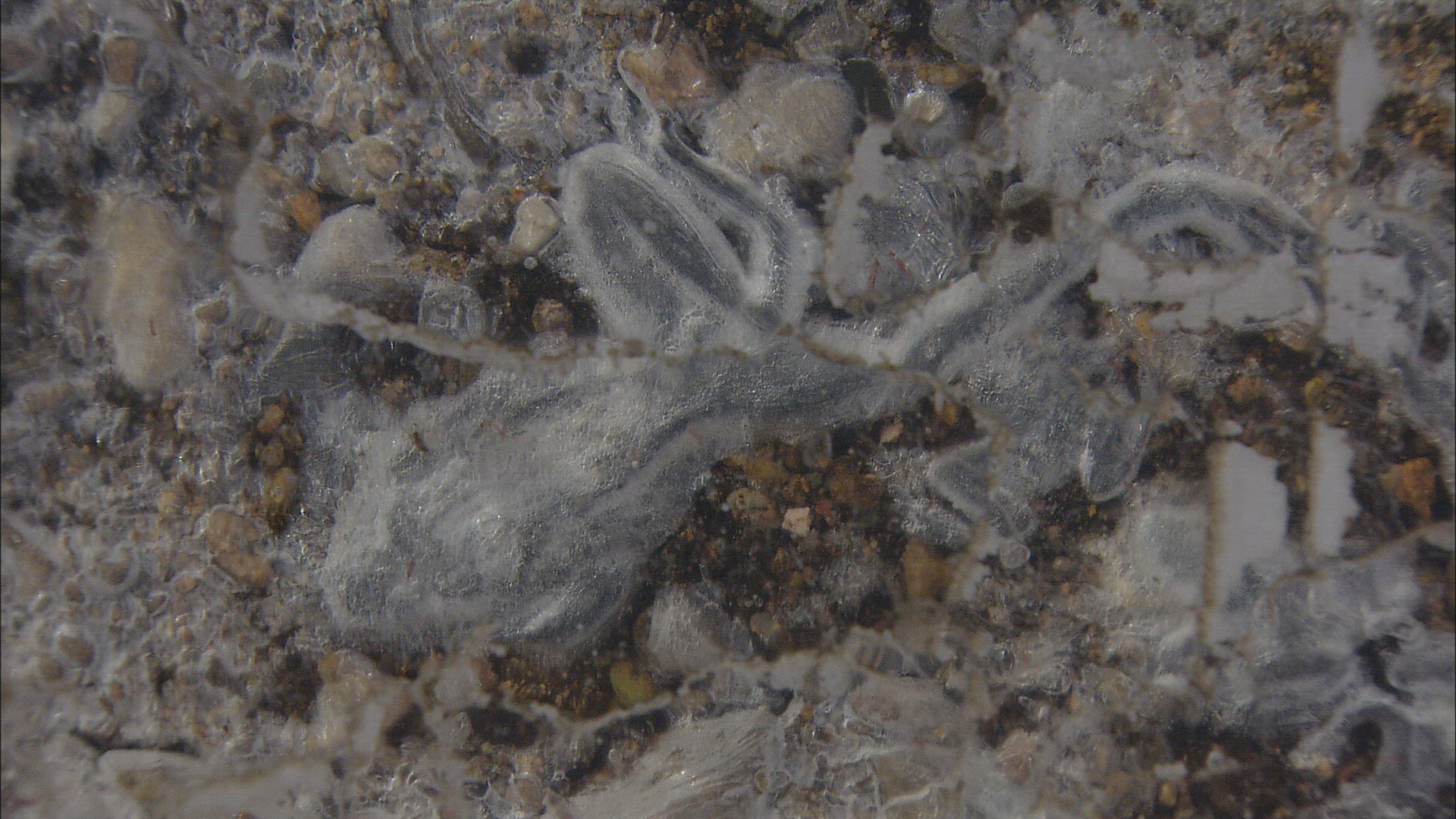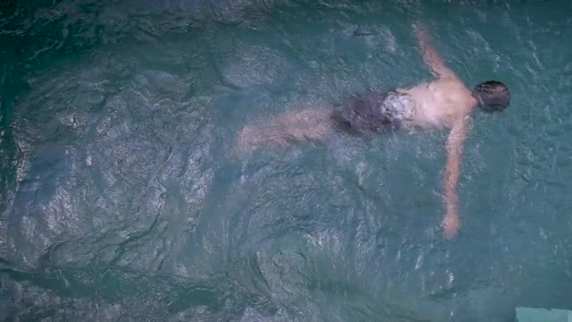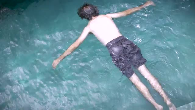 Medium shot of a caucasian man floating face down in a pool as if he has drowned or died.