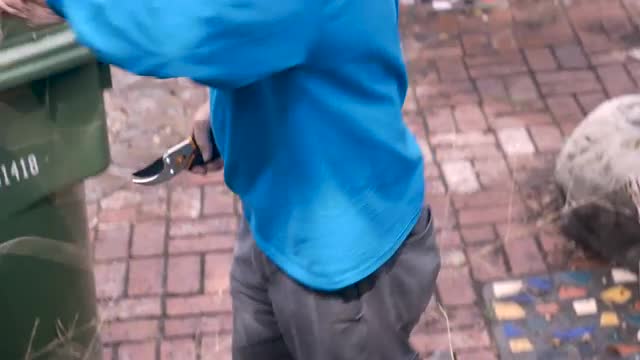 > An active elderly senior wheels an empty trash can into his yard