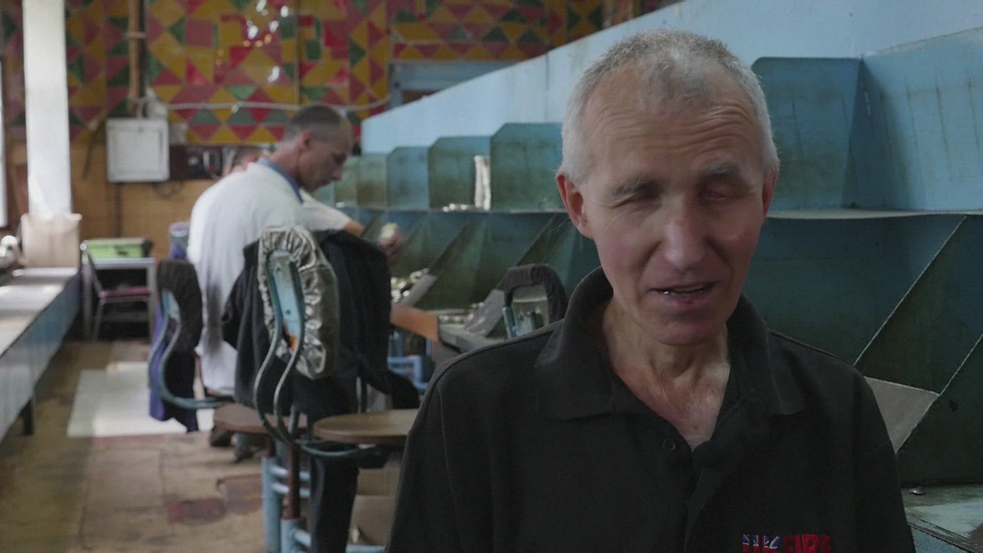A very old woman in her 90s looks at a mobile tablet, laughing and smiling and then talks with her son in his 70s next to her on a sofa