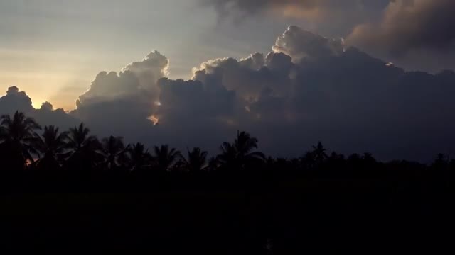Timelapse of a colorful sunset seen through tropical plants in Bali with fast moving low flying clouds
