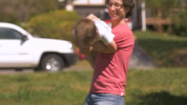 A man spinning around a cute young boy outside in slow motion